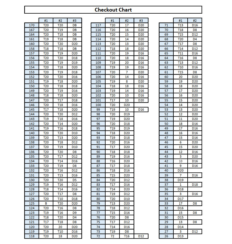 Checkout Chart Use this Checkout Chart to get the right numbers to finish with a double. Download this Checkout chart here Back